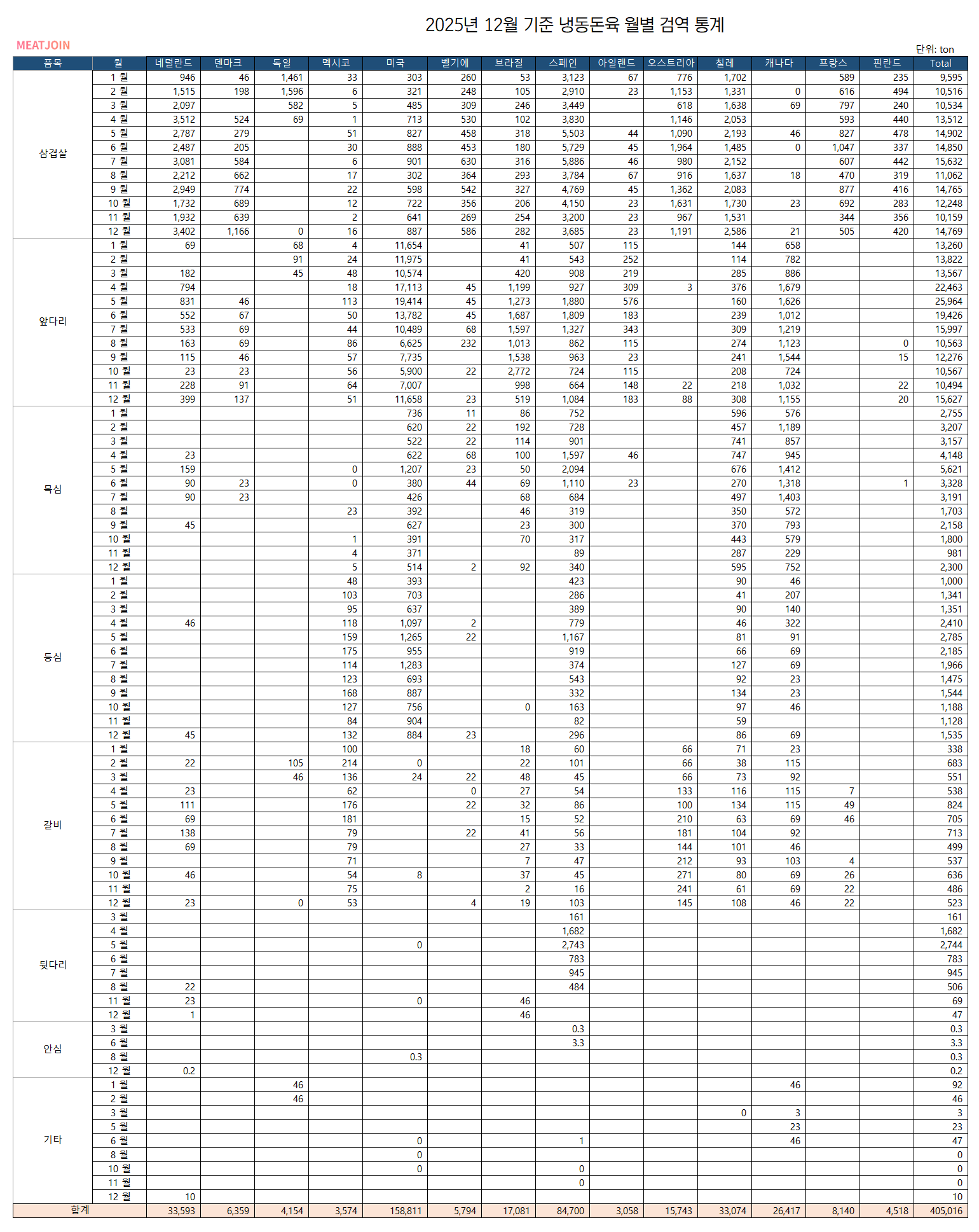 2025년 12월 냉동돈육 월별 검역 통계