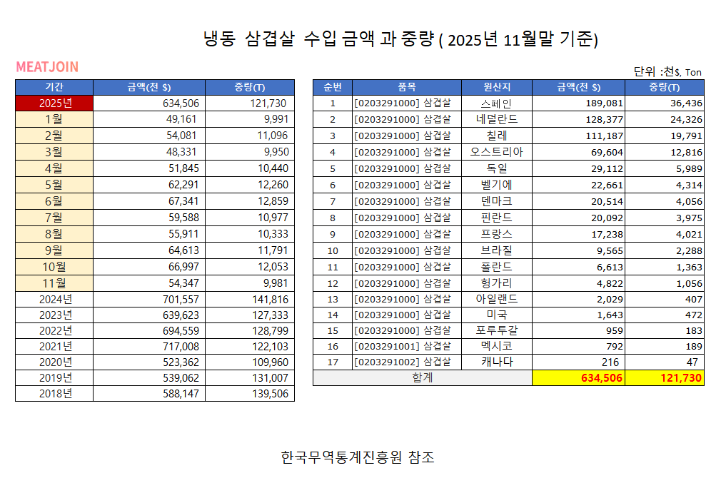 (2025년 10월말 기준) 냉동돈육 삼겹살 국가별 수입금액과 수입중량