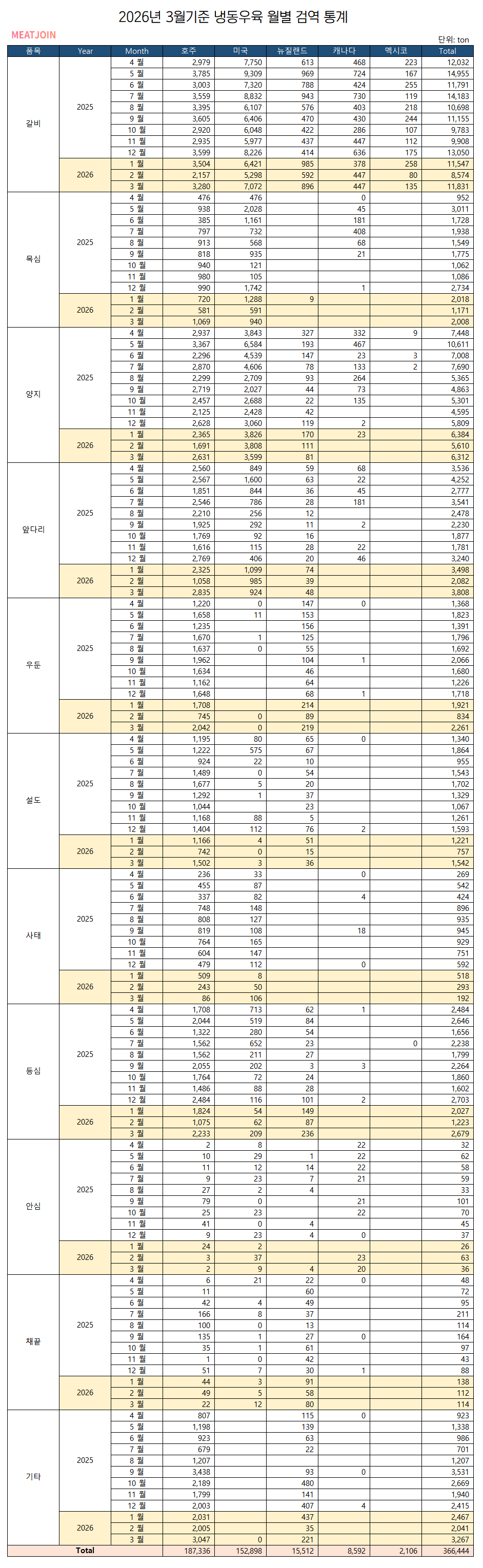 2026년 3월 냉동우육 월별 검역 통계