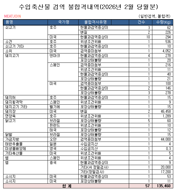 수입축산물 검역 불합격내역 (2026.2월분)