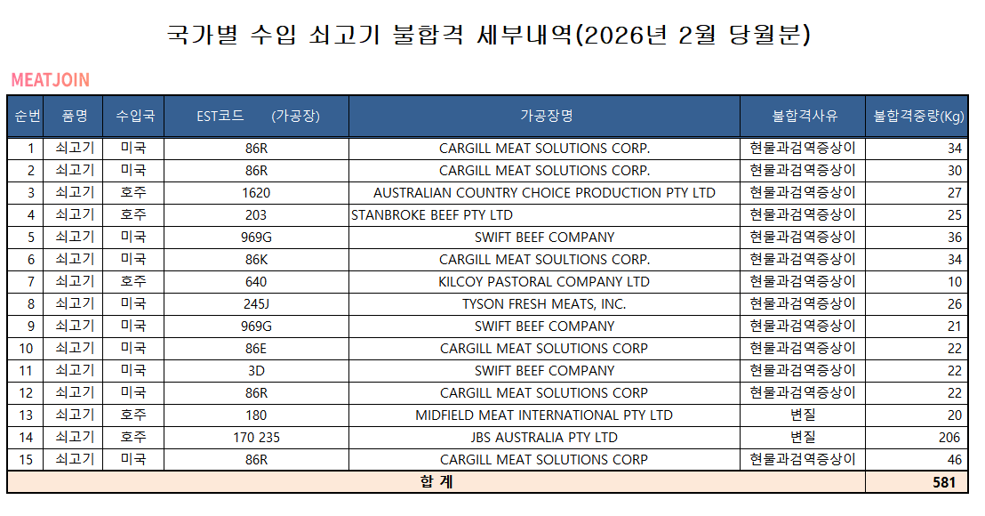 수입쇠고기 국가별 불합격내역 (2026.2월분)