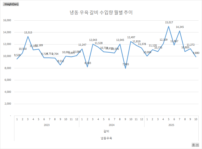 제목 2025년 10월 기준 냉동갈비 검역량 기준 차트
